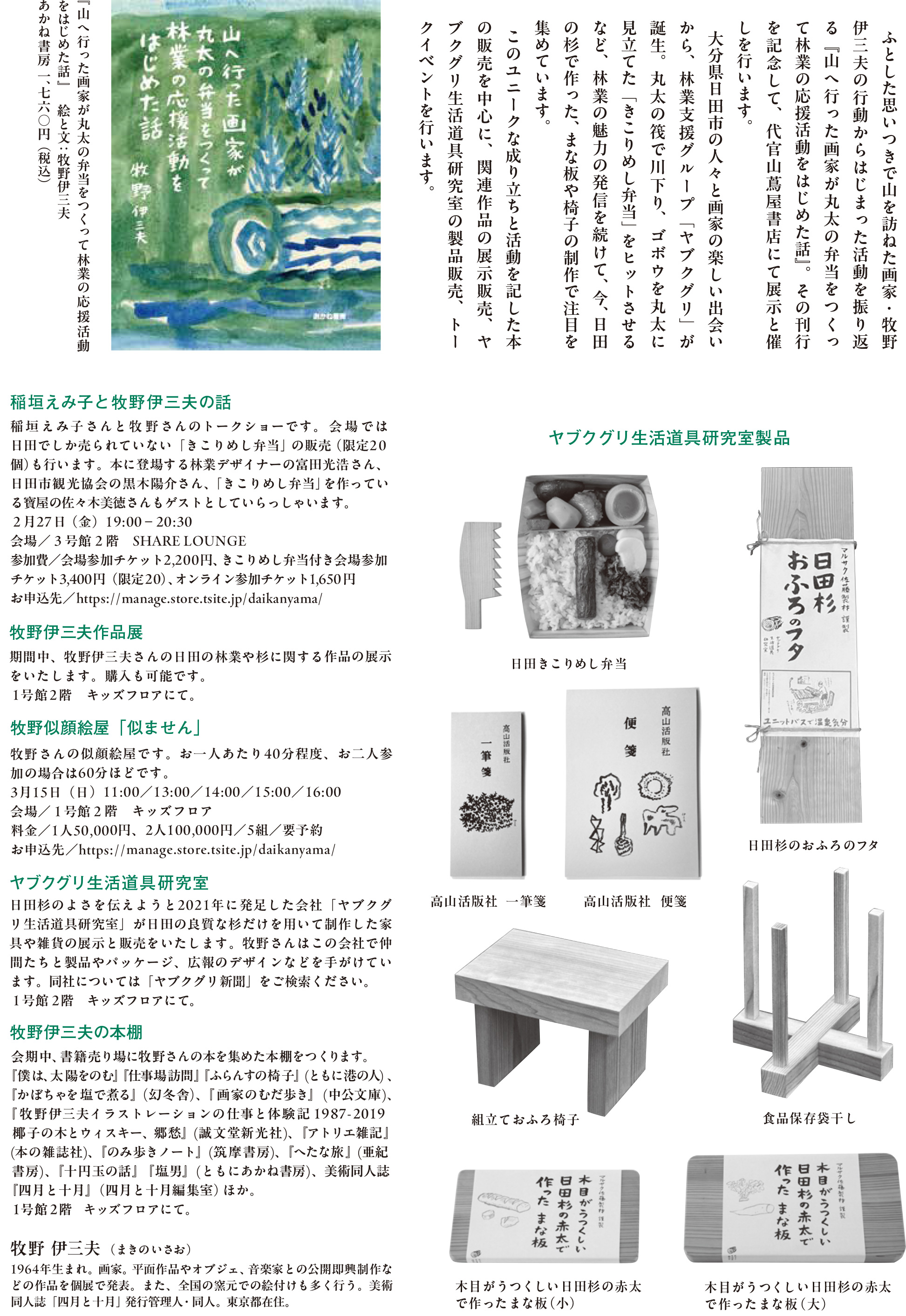 - ふとした思いつきで山を訪ねた画家・牧野伊三夫の行動からはじまった活動を振り返る『山へ行った画家が丸太の弁当をつくって林業の応援活動をはじめた話』。その刊行を記念して、代官山蔦屋書店にて展示と催しを行います。