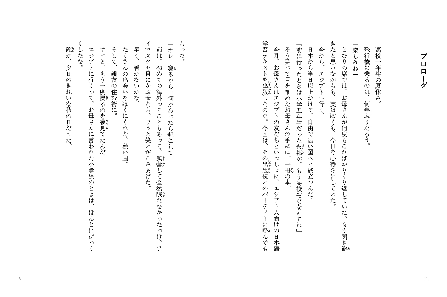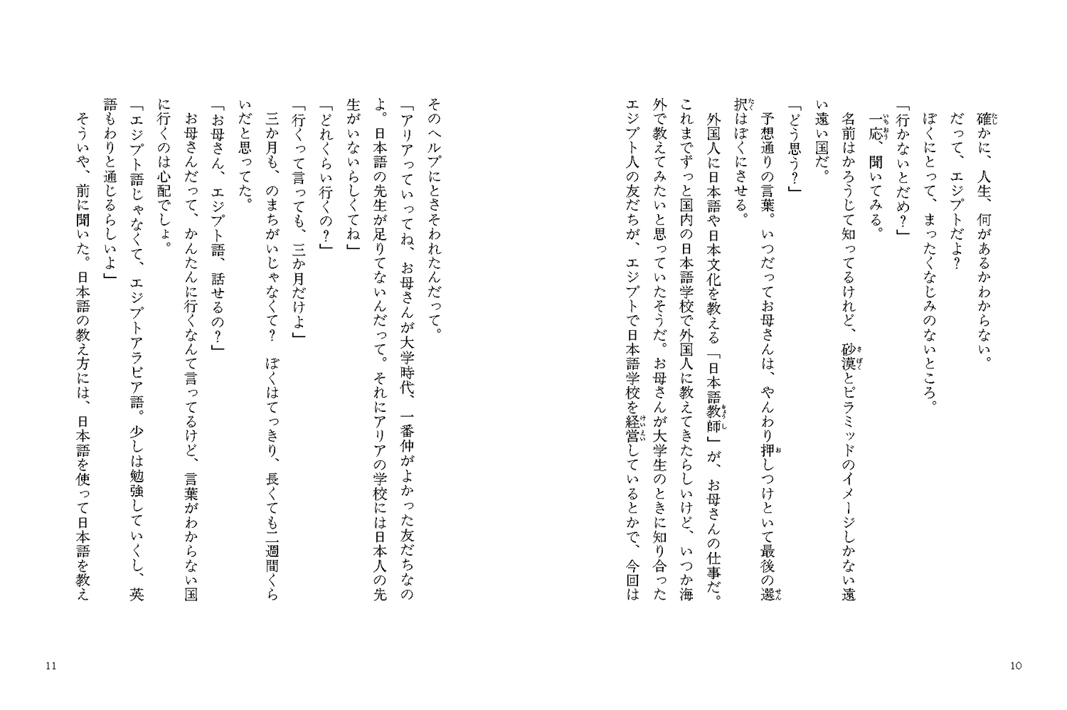 不登校の日々を送っていた小学5年生の永都は、とつぜん母から「エジプトへ行こう」と誘われる。異文化の一つひとつに驚きつつも、年の近い少年・マドと出会い、「エイト」と親しみを込めて呼ばれるほど仲良くなり、自分を見つめ始める。しかし、コロナのパンデミックで、エジプトにアジア人差別が……。はじめての海外生活で、文化のちがいにとまどい、緊急事態も発生! まるで冒険のような状況の中で成長していく少年の物語!